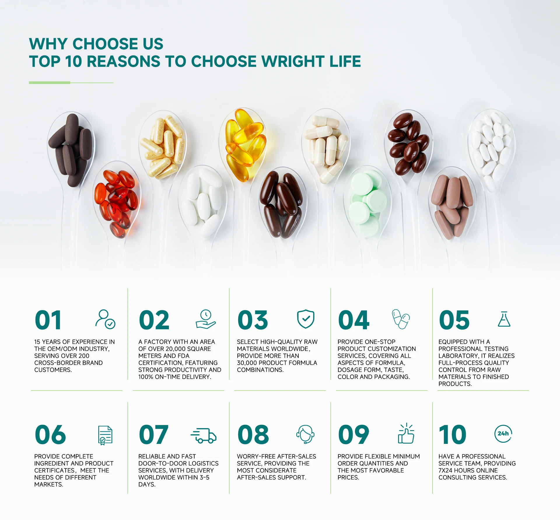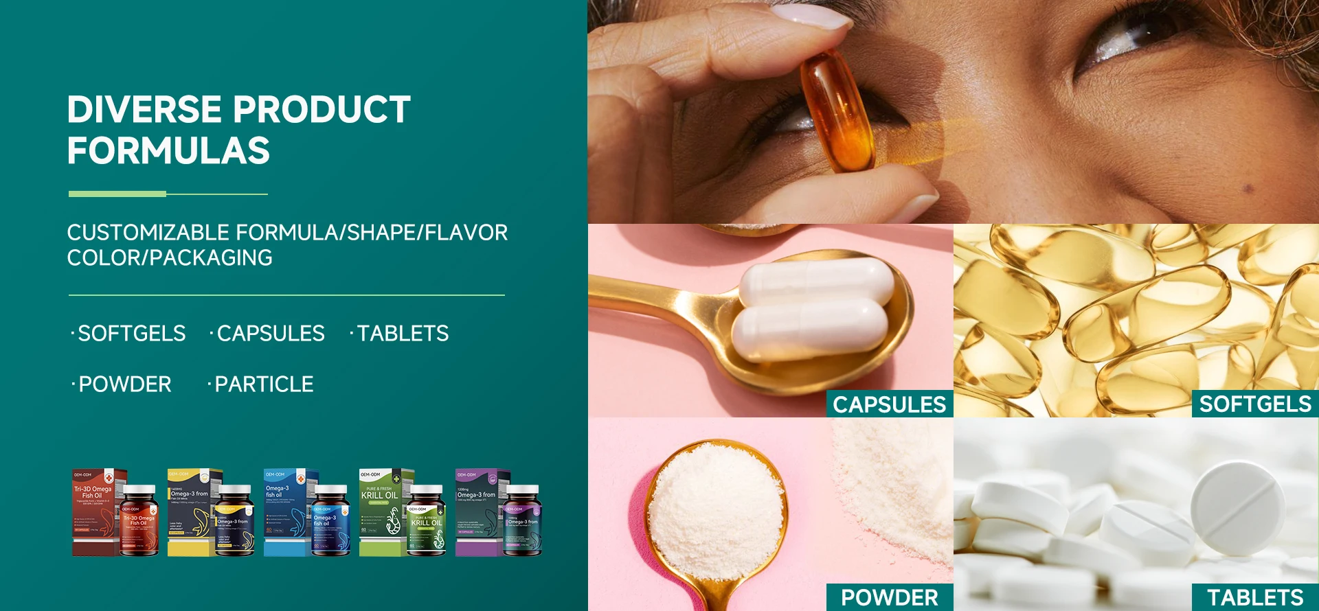 Productos principales:Aceite de pescado, probióticos, proteína en polvo, cápsula blanda o dura (dispositivo médico), tableta de caramelo